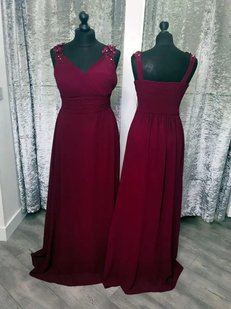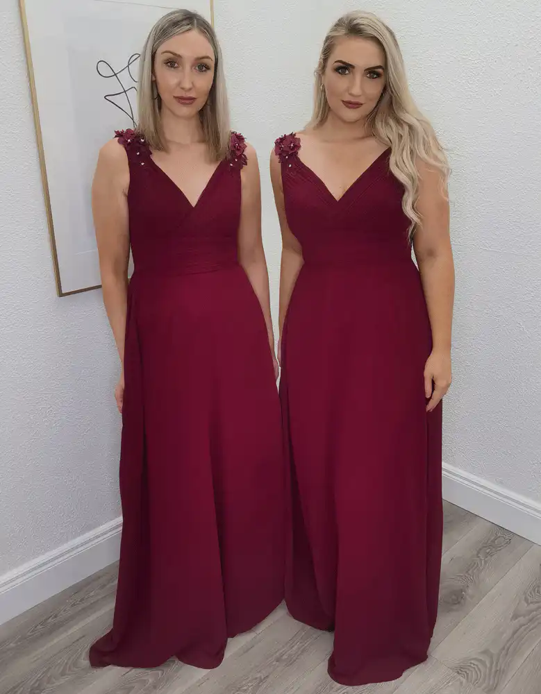The Shelly Bridesmaid Dress in Burgundy is a stunning floor-length gown that exudes timeless elegance, featuring a flattering V-neckline and a sleek A-line silhouette crafted from smooth, flowing chiffon. Delicate floral and pearl embellishments adorning the wide straps add a beautifully romantic finishing touch, elevating this classic style to something truly special. Perfect for bridesmaids who want to look effortlessly polished and coordinated, the Shelly is available at Obsession Showroom in a range of sizes to suit every figure beautifully.