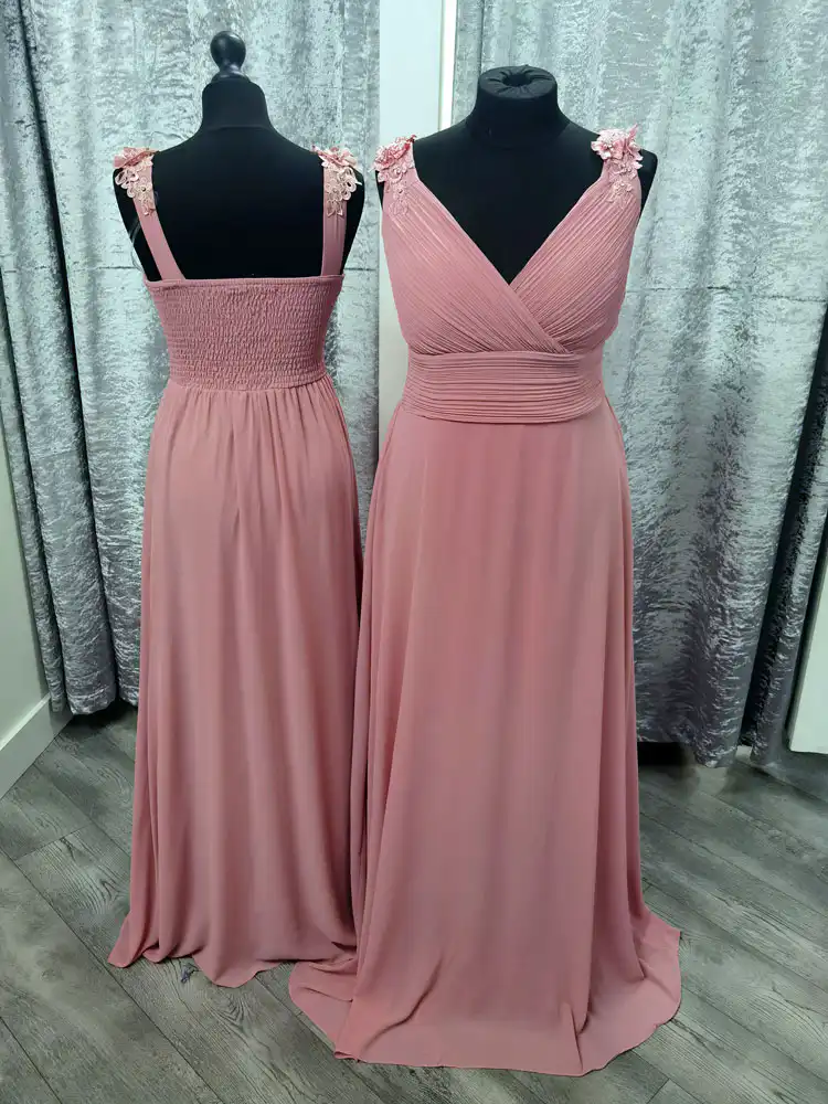 Shelly is a beautifully romantic bridesmaid dress crafted in soft dusky pink chiffon, featuring an elegant V-neckline and a flowing A-line silhouette that flatters every figure. Delicate floral appliqué embellishments adorn the straps, adding a touch of feminine charm, while the ruched waistband creates a graceful, defined shape. Perfect for weddings of any style, Shelly is available to try on at Obsession Showroom in Carlow — a dress your bridal party will absolutely love.