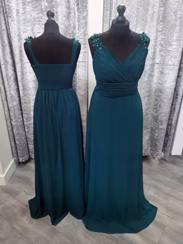 This is a big hit in store, it genuinely suits all sizes. It is made from chiffon fabric with a satin lining. The ruching detail on the bust and waist area are really flattering. The skirt flows past the tummy area and avoids clinging to the tummy. It has beautiful lace and beaded details on the shoulders. The stretch back makes it extremly comfortable to wear.