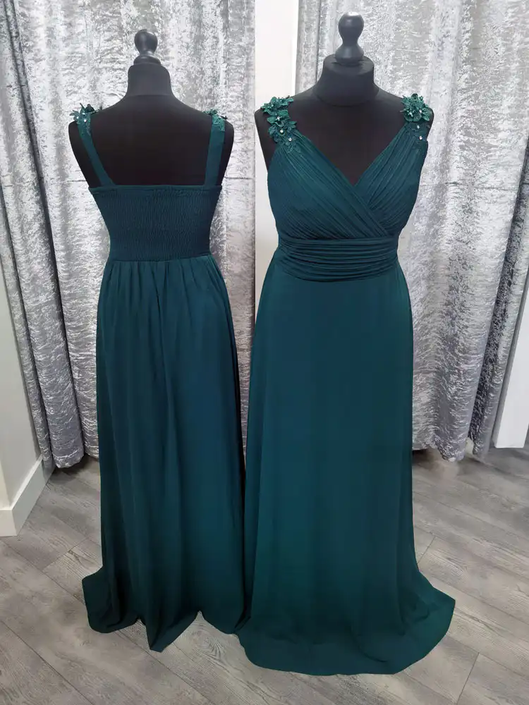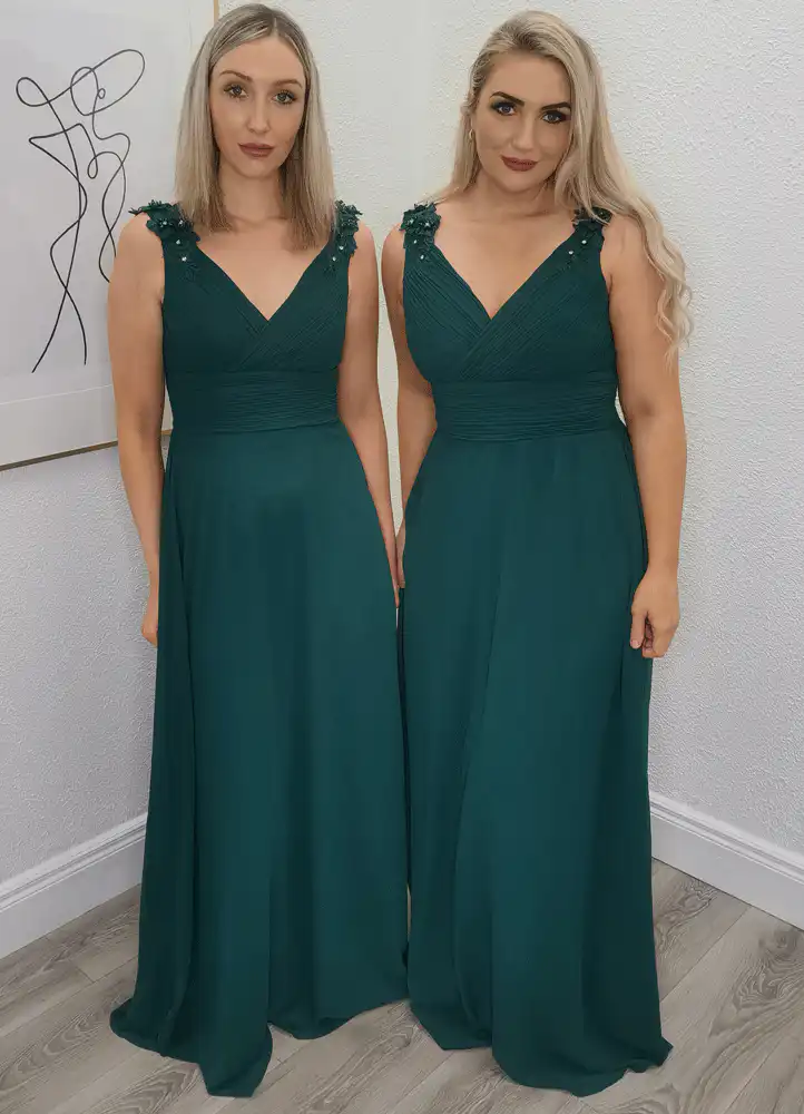 A stunning floor-length gown, the Shelly Bridesmaid Dress in Emerald Green is the perfect choice for your bridal party. Crafted in flowing chiffon, this elegant A-line silhouette features a flattering V-neckline, softly pleated empire waist, and delicate floral and beaded embellishments along the straps for a touch of romance. A timeless and sophisticated style that photographs beautifully and suits bridesmaids of every shape.