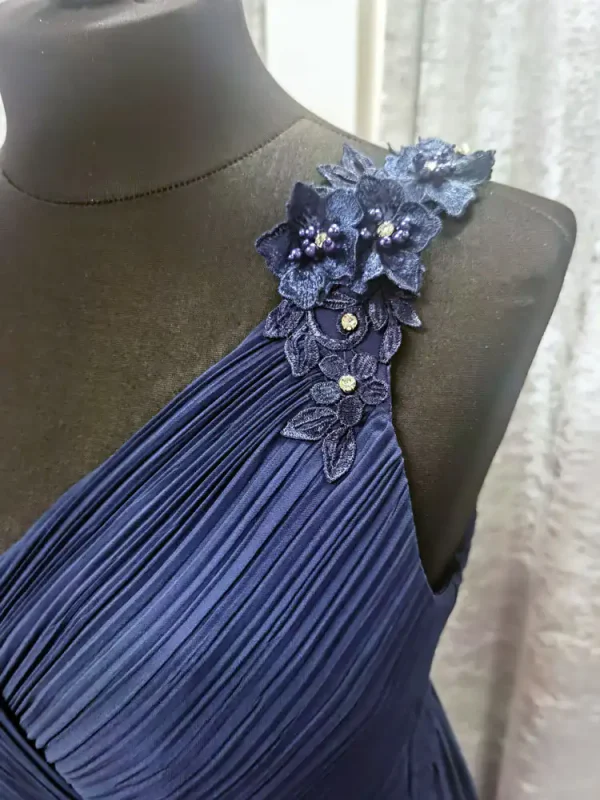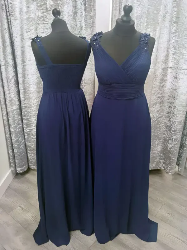 Shelly is a stunning floor-length bridesmaid dress in rich navy, crafted from flowing chiffon that drapes beautifully for an elegant, effortless silhouette. The flattering V-neckline and ruched waistband create a timeless A-line shape, while the wide straps are adorned with delicate 3D floral appliqué and pearl detailing for a touch of romance. Perfect for weddings and formal occasions, Shelly is available at Obsession Showroom and is sure to make your bridal party look and feel truly special.