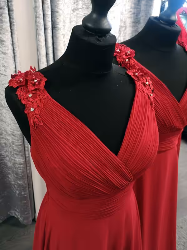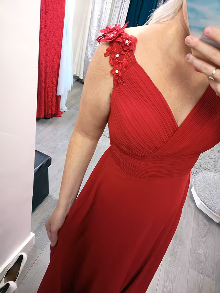 This is a big hit in store, it genuinely suits all sizes. It is made from chiffon fabric with a satin lining. The ruching detail on the bust and waist area are really flattering. The skirt flows past the tummy area and avoids clinging to the tummy. It has beautiful lace and beaded details on the shoulders. The stretch back makes it extremly comfortable to wear.