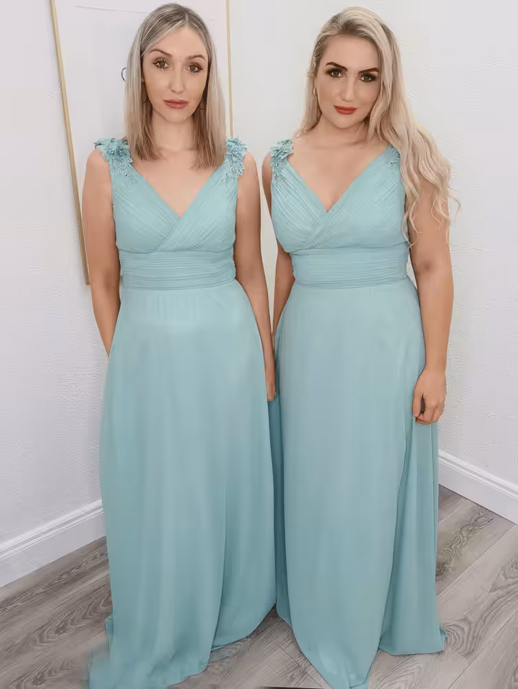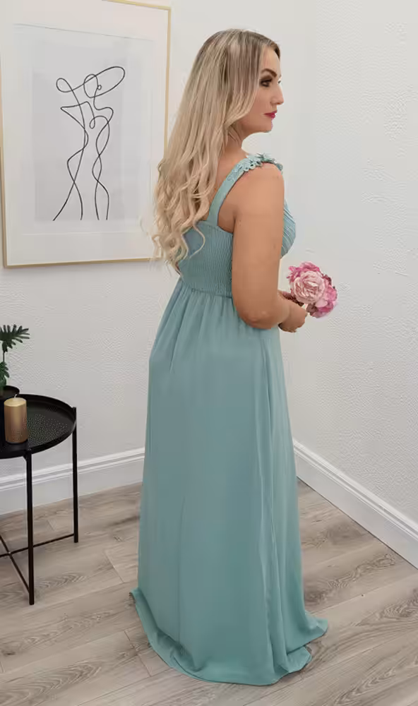 This is a big hit in store, it genuinely suits all sizes. It is made from chiffon fabric with a satin lining. The ruching detail on the bust and waist area are really flattering. The skirt flows past the tummy area and avoids clinging to the tummy. It has beautiful lace and beaded details on the shoulders. The stretch back makes it extremly comfortable to wear.