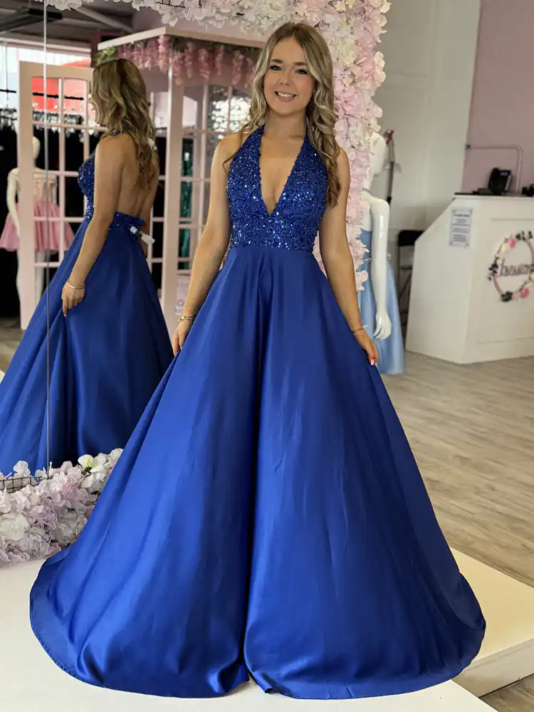 Make a breathtaking entrance in the Shona Royal Blue Halter Neck A-Line Gown, featuring a stunning deep V halter neckline adorned with intricate sequin and beaded embellishment that catches the light beautifully. The luxurious royal blue satin skirt flows into a dramatic A-line silhouette, creating an effortlessly elegant and show-stopping look perfect for your debs night. An in-store exclusive available only at Obsession Showroom.