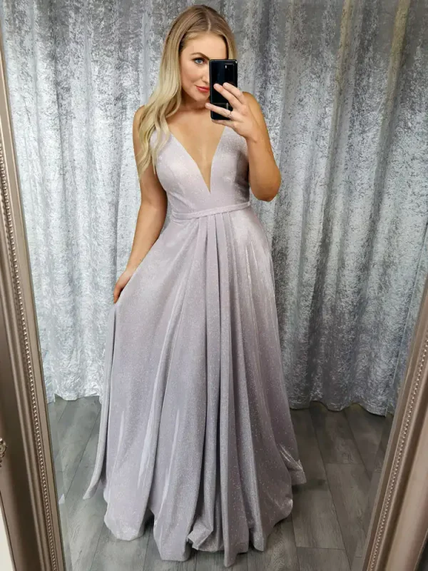 This stunning Silver Glitter Ballgown shimmers with an all-over metallic sparkle fabric that catches the light beautifully, making it an unforgettable choice for your debs night. The elegant deep V-neckline and fitted bodice flow effortlessly into a full, sweeping A-line skirt, creating a classic and glamorous silhouette. Now available at a special sale price in our Carlow boutique, this dreamy gown is perfect for making a dazzling entrance on one of the most memorable nights of your life.