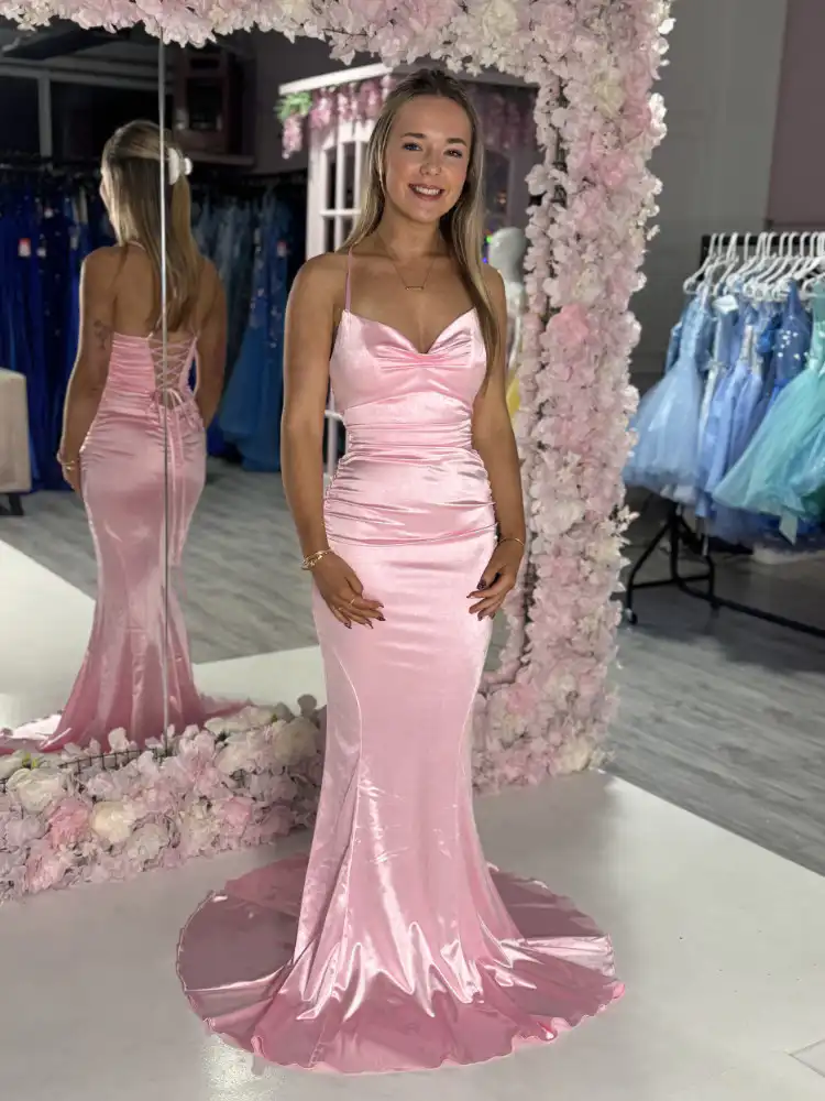 Skylite Pink Fitted Dress is a show-stopping mermaid silhouette gown in a lustrous blush pink satin, featuring a delicate sweetheart neckline with spaghetti straps and elegant ruched detailing at the waist that flatters every curve. The floor-length style flows into a graceful train, while the lace-up corset back — glimpsed in the mirror — adds a romantic, finishing touch that’s perfect for your debs night. An in-store exclusive available only at Obsession Showroom.