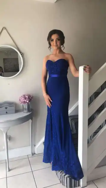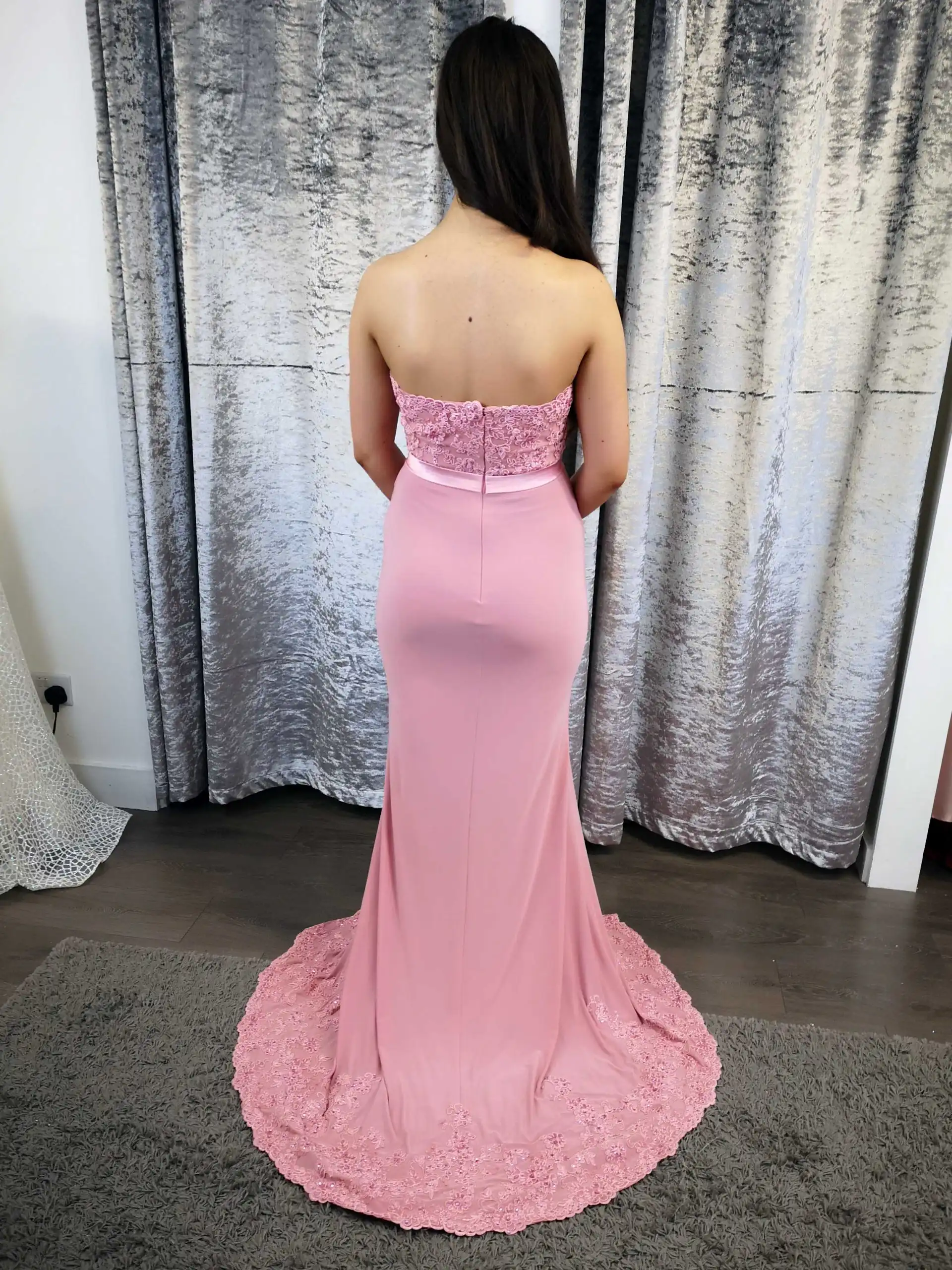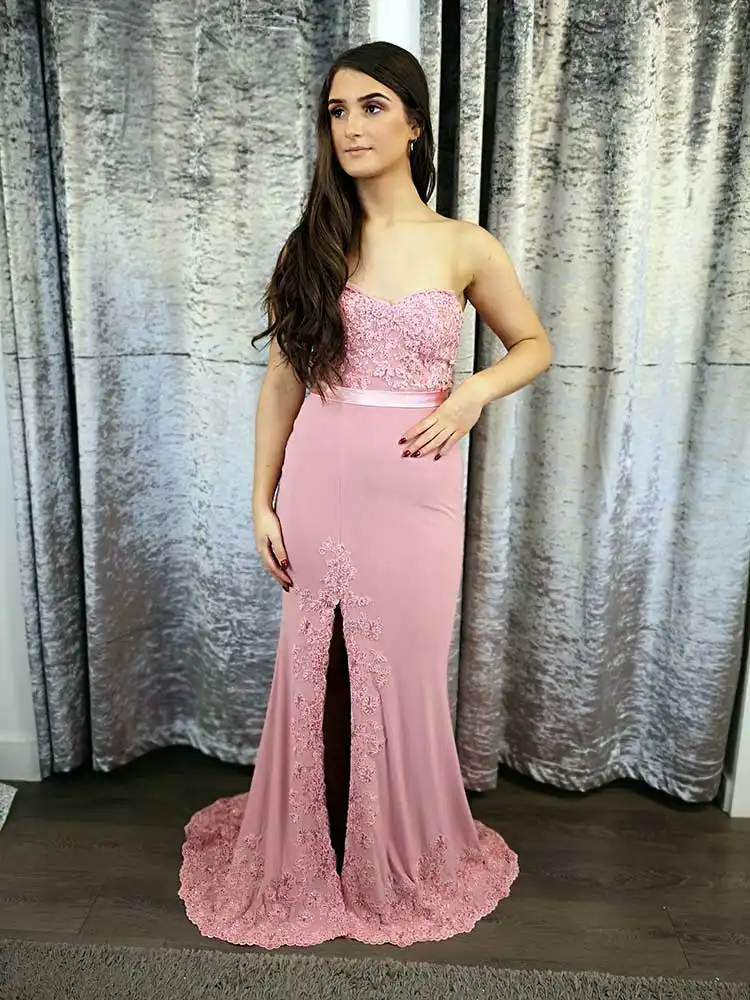This stunning blush pink mermaid gown, the Sophia, features a sweetheart neckline and a sleek stretch fabric that hugs the figure beautifully, flowing into an elegant flared hem adorned with delicate floral lace appliqué. The lace-detailed bodice adds a romantic, feminine touch, while a subtle satin waistband and a front split lend effortless glamour — perfect for making a memorable entrance at your debs night. An in-store exclusive available only at Obsession Showroom.
