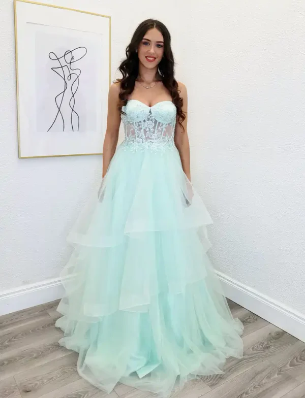 Steph is a dreamy mint ballgown that combines a sheer, floral lace corset bodice with a sweetheart neckline and a dramatically layered tulle skirt for an effortlessly romantic silhouette. The soft mint hue and delicate appliqué detailing make this gown a true showstopper, perfect for your debs night or any formal occasion where you want to feel like the belle of the ball. An in-store exclusive available only at Obsession Showroom.