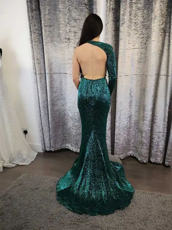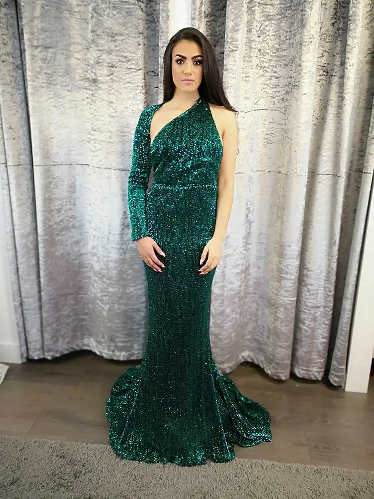 Tessa Green is a showstopping emerald sequin gown that’s guaranteed to turn heads on your debs night. This glamorous mermaid-silhouette dress features a dramatic one-shoulder neckline with a single long sleeve, creating a bold asymmetric look that’s equal parts elegant and fashion-forward. The all-over sequin fabric catches the light beautifully with every step, making Tessa the perfect choice for any girl who wants to own the room.