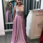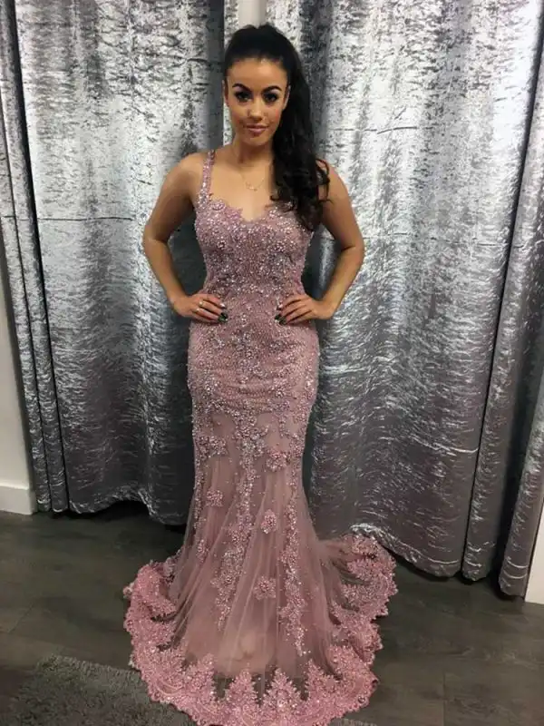 Tianna is a showstopping dusty rose mermaid gown that hugs every curve with effortless elegance, featuring a sweetheart V-neckline and delicate spaghetti straps. The dress is adorned with intricate lace appliqués, shimmering beading, and pearl embellishments throughout, flowing into a graceful fishtail train that trails beautifully at the floor. Perfect for your debs night, Tianna will have you turning heads from the moment you walk through the door.