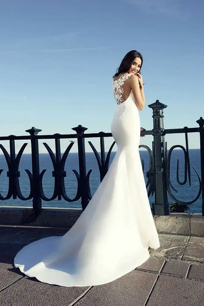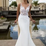 A breathtakingly elegant mermaid silhouette, the Vanessa Wedding Dress is crafted in smooth ivory satin-like fabric that skims every curve before flaring into a graceful sweeping train. The illusion neckline features exquisite lace and floral appliqué detailing across the bodice, creating a beautifully feminine and romantic look that is both timeless and sophisticated. A stunning choice for the modern bride, and now available at a special sale price exclusively at Obsession Showroom in Carlow.