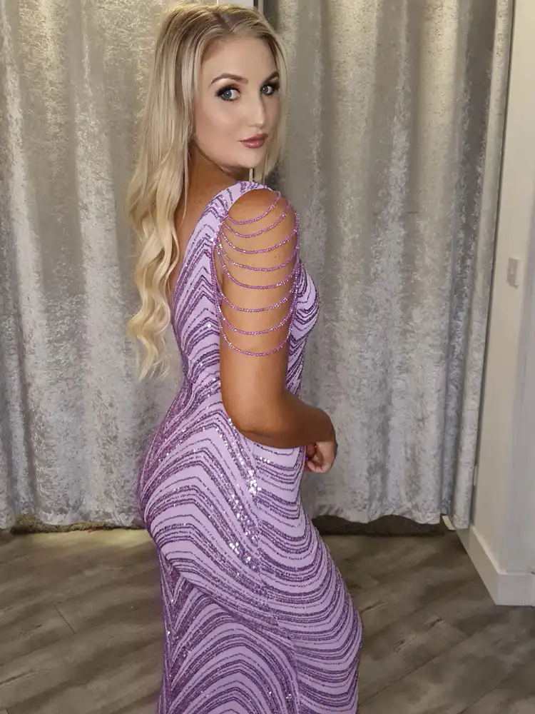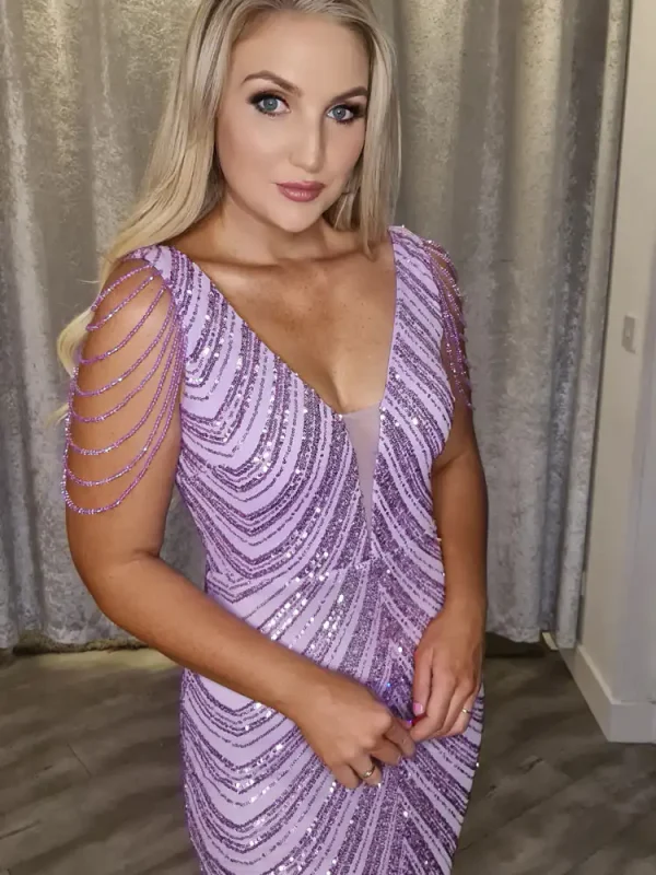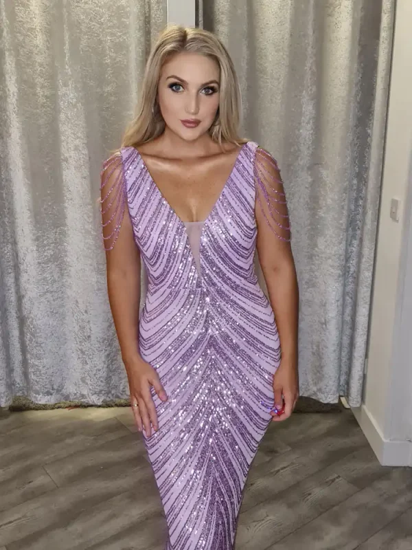 Make a stunning entrance in the Victoria Lilac Dress, a breathtaking floor-length mermaid gown adorned with dazzling sequin stripe embellishments that catch the light beautifully with every step. The deep V-neckline and figure-hugging silhouette create an effortlessly glamorous look, while delicate sheer cap sleeves with trailing crystal-effect detailing add a truly show-stopping finishing touch. Perfect for your Debs night, this gorgeous lilac gown is available now at a special sale price — don’t miss your chance to secure this showstopper at Obsession Showroom.