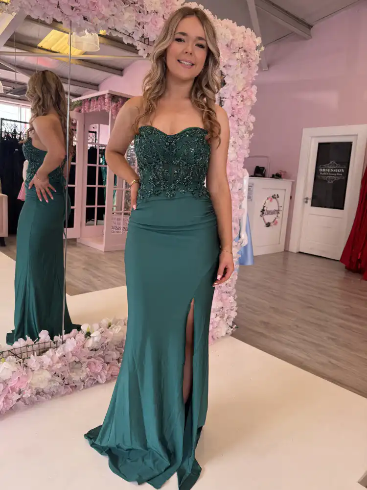 Ziki Emerald Green Fitted Evening Dress is a stunning floor-length gown that combines a sleek, figure-hugging silhouette with an elegant strapless sweetheart neckline, making it an effortlessly glamorous choice for your debs night. The bodice is beautifully adorned with intricate beaded lace appliqué that adds a touch of sparkle and sophistication, while the smooth stretch fabric flows seamlessly into a fitted skirt with a flattering front split. Perfect for making a memorable entrance, this show-stopping gown is ideal for debs, formal evenings, or any occasion where you want to look and feel truly extraordinary. An in-store exclusive available only at Obsession Showroom.
