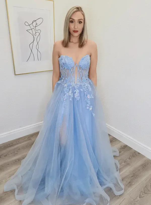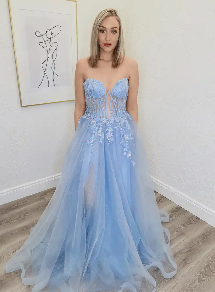 Zuri is a breathtaking powder blue ballgown that effortlessly combines fairytale romance with modern elegance, featuring a sweetheart neckline with delicate lace-up corset detailing and stunning floral lace appliqué adorning the bodice. The dreamy, voluminous tulle skirt flows gracefully to the floor, catching the light beautifully and making it the ultimate showstopper for your debs night. An in-store exclusive available only at Obsession Showroom.